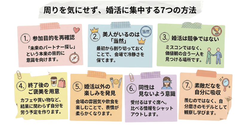 周りを気にせず婚活パーティーに集中できる方法を紹介します。