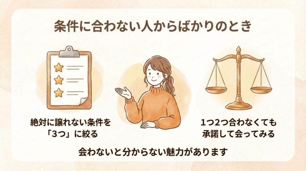 希望条件に合わない人から申込がくる:条件の1つ2つ合わなくてもOKする
