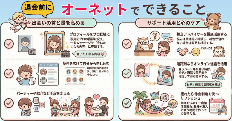 オーネットには、月会費を抑えて活動を一時的にお休みできる休会制度があります。