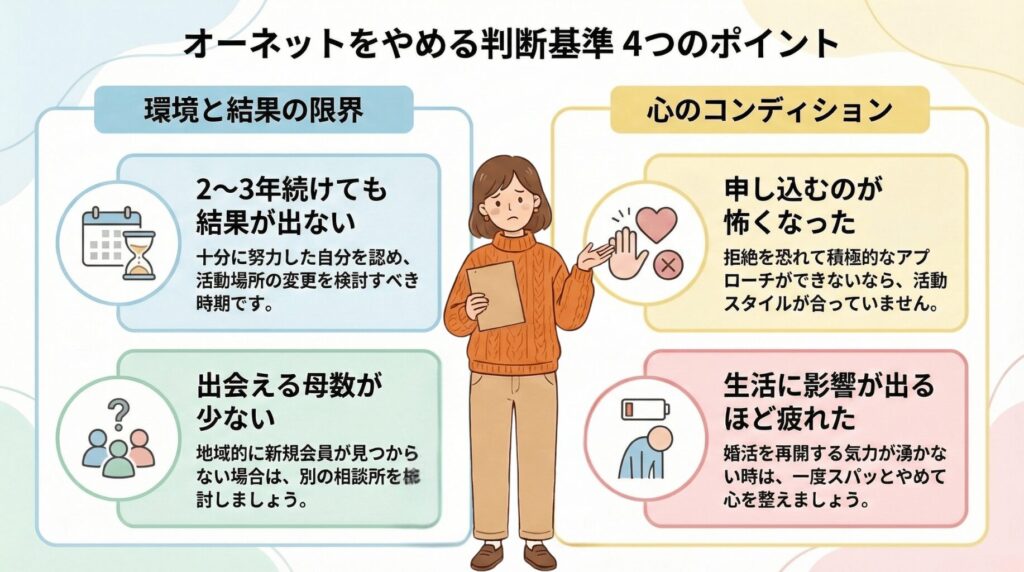 オーネットに入っても会えなかったり、お断りが続くと、「(結婚できないから)やめようかな」と頭によぎってしまいませんか?