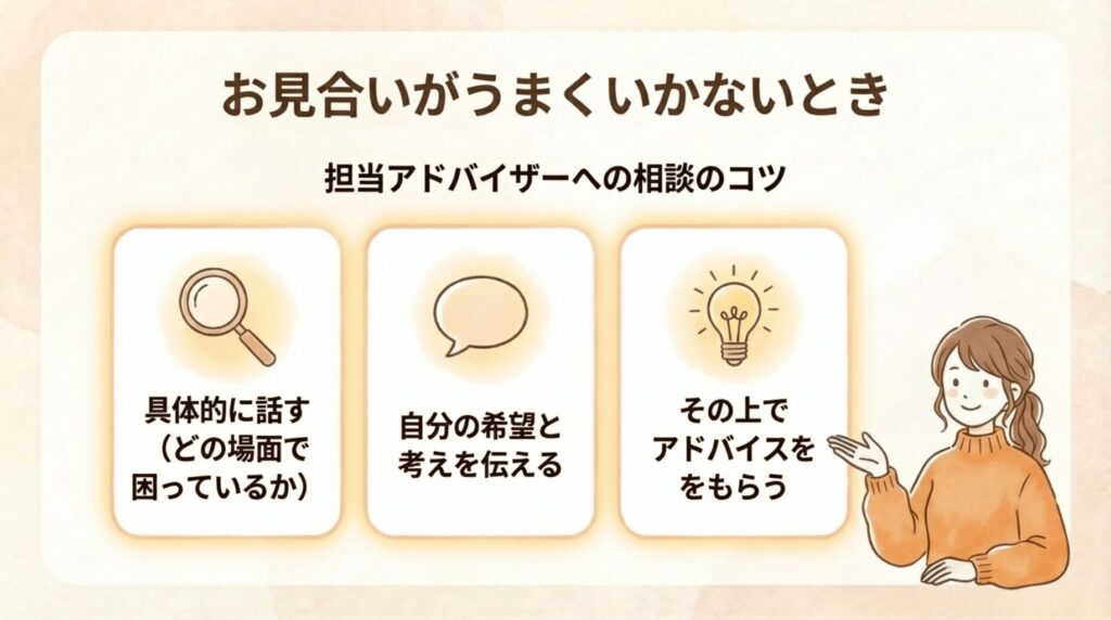 | お見合いがうまくいかない | 担当アドバイザーに相談 |