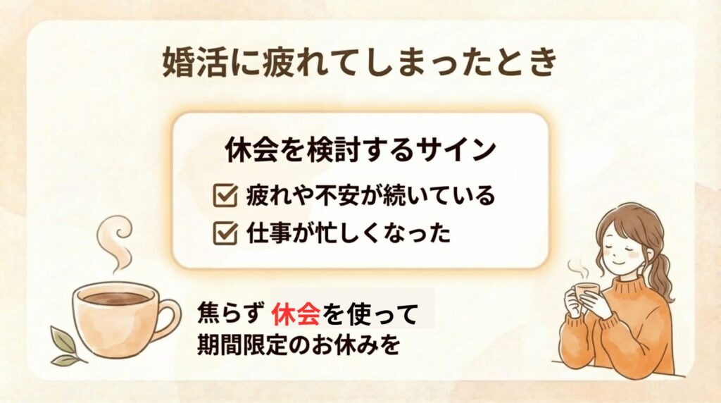 | 婚活に疲れた | 休会を使って期間限定で活動を休む |