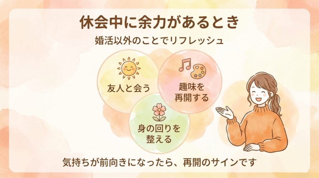 「今は婚活を考えたくないけれど、いつか再開するかも」という気持ちが少しでもあるなら、一度立ち止まってリフレッシュする時間を作るのも選択肢の一つです。