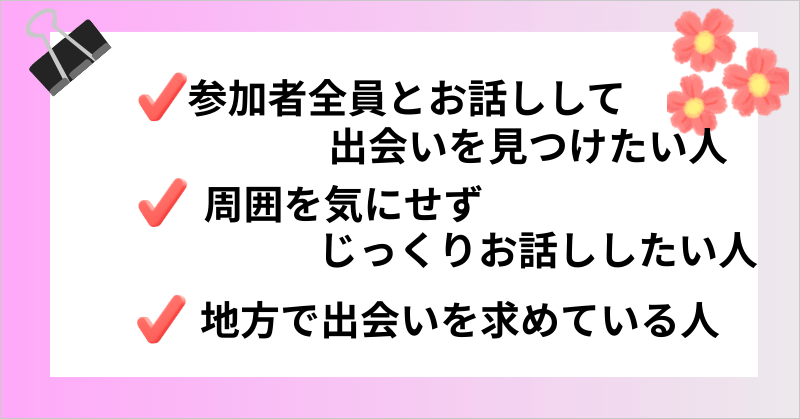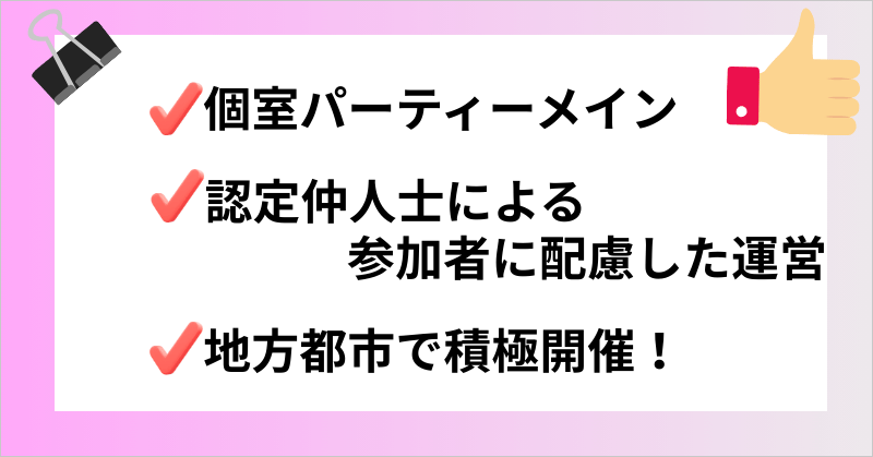 地方都市メインで開催してるので、首都圏以外で出会いを求める方向けの婚活イベントです。
