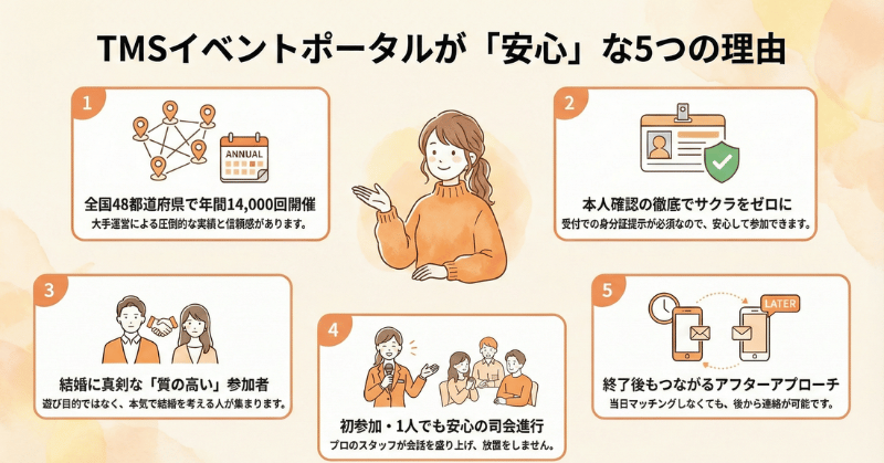 TMS婚活イベントポータルは参加時の本人確認はもちろん、スタッフの行き届いた司会進行や多彩な価値観や趣向からイベントを選べるので安心して参加できます。